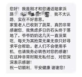 宋阿姨因患有脊髓性肌萎縮癥常年臥床,身邊僅有一位同歲的陪護(hù)阿姨照料。疾病讓她對(duì)新鮮蔬菜的需求更為迫切:“因?yàn)镾MA患者的肌肉是萎縮的,我都是要用開(kāi)塞露才能大便的,然后還需要陪護(hù)阿姨狠狠壓我的肚子。我為什么著急呢?如果沒(méi)有這些蔬菜吃,萬(wàn)一我堵住了,就會(huì)腸梗阻。陪護(hù)阿姨把蔬菜拿回來(lái)時(shí)我真的很感動(dòng),都要流眼淚了,好多的新鮮蔬菜正是我需要的,有青菜、萵筍、黃瓜……都是我跟他們說(shuō)過(guò)的,所以后來(lái)那天來(lái)了物資,我就馬上吃上蔬菜了。”