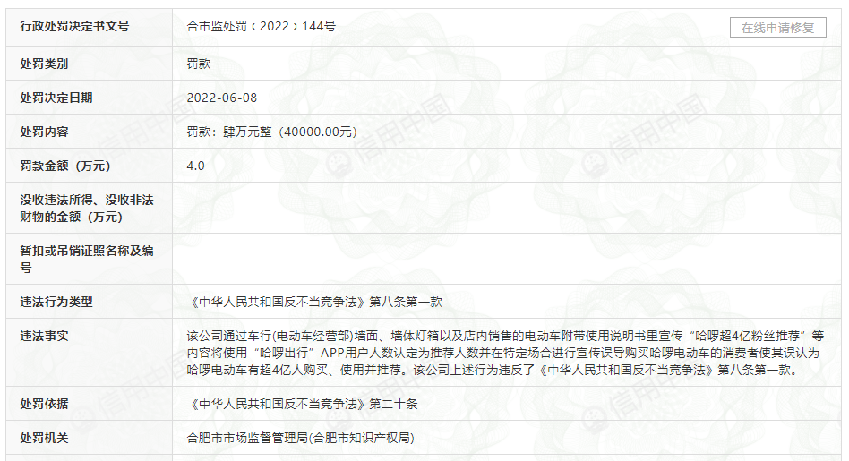 中國(guó)市場(chǎng)監(jiān)管行政處罰文書網(wǎng)顯示,2020年5月,哈啰所屬企業(yè)上海鈞正網(wǎng)絡(luò)科技有限公司違反了《侵害消費(fèi)者權(quán)益行為處罰辦法》第六條第(八)項(xiàng):“經(jīng)營(yíng)者向消費(fèi)者提供有關(guān)商品或者服務(wù)的信息應(yīng)當(dāng)真實(shí)、全面、準(zhǔn)確,不得有下列虛假或者引人誤解的宣傳行為:(八)夸大或隱瞞所提供的商品或者服務(wù)的數(shù)量、質(zhì)量、性能等與消費(fèi)者有重大利害關(guān)系的消息誤導(dǎo)消費(fèi)者”的規(guī)定,構(gòu)成了經(jīng)營(yíng)者向消費(fèi)者提供有關(guān)商品或者服務(wù)的信息不真實(shí)、不全面、不準(zhǔn)確的行為。綜上,上海市閔行區(qū)市場(chǎng)監(jiān)督管理局對(duì)上海鈞正網(wǎng)絡(luò)科技有限公司處以罰款4000元。
