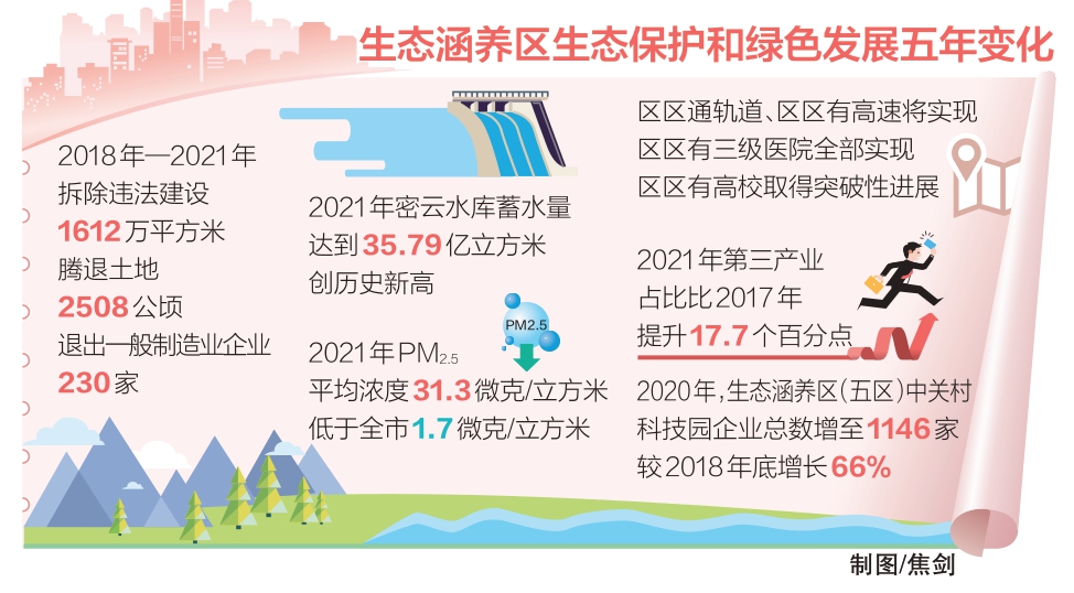 數(shù)據(jù)顯示,2018年到2021年,生態(tài)涵養(yǎng)區(qū)累計(jì)拆除違法建設(shè)1612萬(wàn)平方米、騰退土地2508公頃、退出一般制造業(yè)企業(yè)230家。