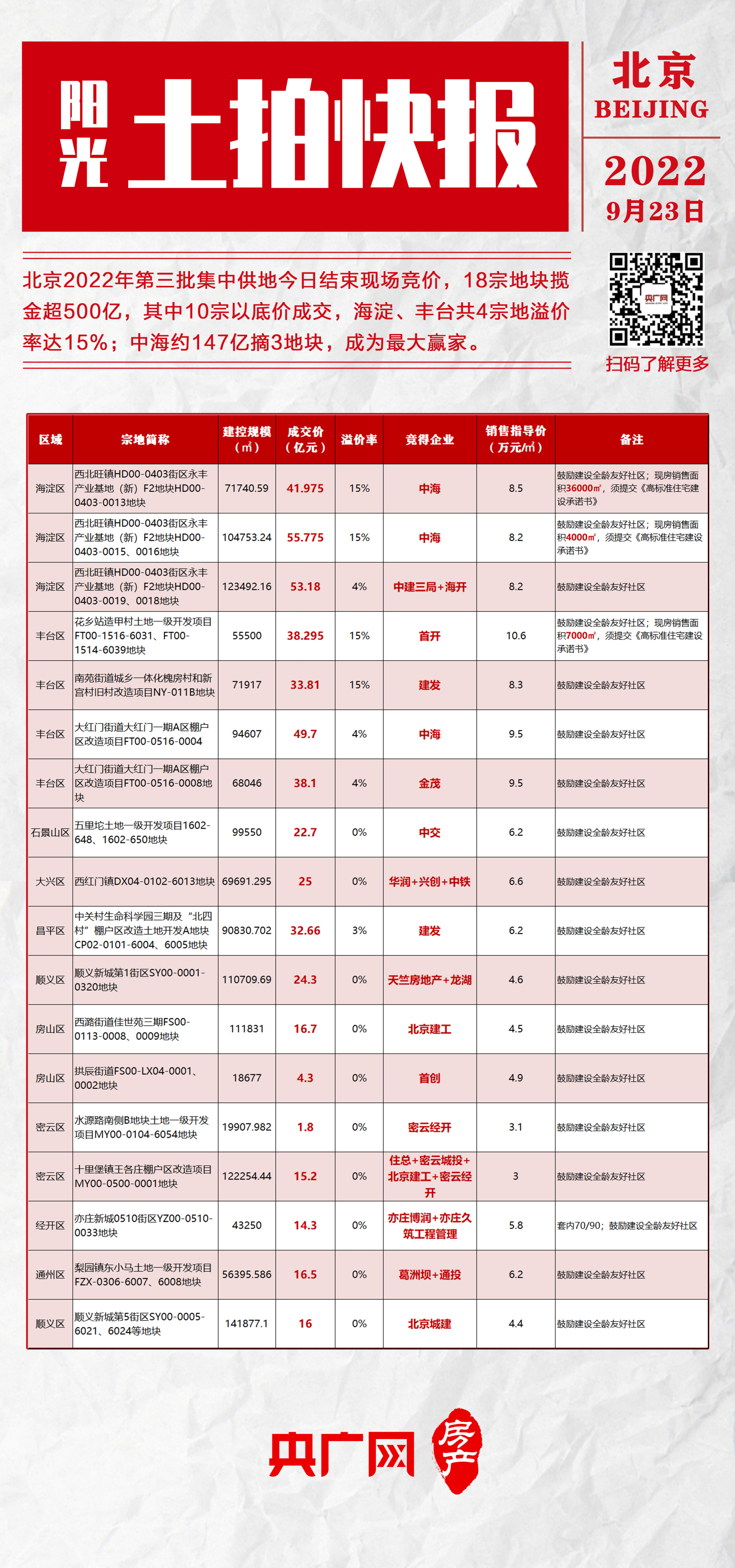 央廣網(wǎng)北京9月23日消息(記者門庭婷)9月23日,北京市2022年第三批集中供地落下帷幕,本次共出讓18宗商品住宅用地,共計攬金500.295億元,總土地面積約74.8萬㎡,總建筑面積約148萬㎡。