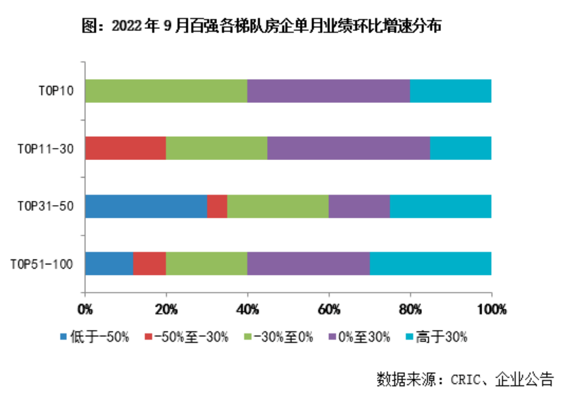 具體從企業(yè)表現(xiàn)來看,克而瑞報告顯示,2022年9月超半數(shù)百強(qiáng)房企實(shí)現(xiàn)單月業(yè)績環(huán)比增長,其中30家企業(yè)的環(huán)比增幅在0%到30%之間,25家企業(yè)環(huán)比增幅超過30%。如華潤、招商、綠地、越秀、仁恒等企業(yè)的環(huán)比增幅均在35%以上。但從業(yè)績同比來看,目前規(guī)模房企整體仍深陷負(fù)增長困局,9月單月業(yè)績同比降低的企業(yè)數(shù)量達(dá)到近7成,僅3成企業(yè)實(shí)現(xiàn)了單月業(yè)績同比增長。