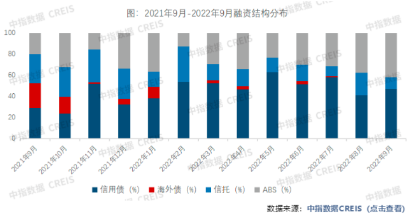 2022年1-9月,房地產(chǎn)企業(yè)非銀融資總額7331.5億元,同比下降52.6%。從融資結(jié)構(gòu)來看,信用債占比50.2%,同比提升19.9個百分點(diǎn);海外債占比僅為2.4%,同比下降14.0個百分點(diǎn);信托占比16.0%,同比下降15.1個百分點(diǎn);ABS占比31.4%,同比提升9.3個百分點(diǎn)。前三季度非銀融資總額分別占比33.1%、35.1%、32.1%,各季度融資比例差異不大,并未出現(xiàn)明顯的融資高峰期。