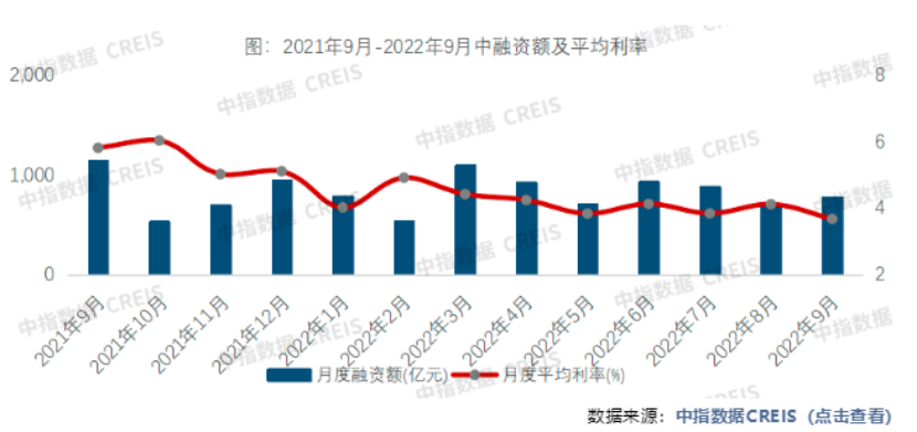 此外,2022年9月,房企無海外債發(fā)行,僅通過發(fā)行信用債進(jìn)行融資。信用債發(fā)行規(guī)模為368.05億元,受上年同期發(fā)行大幅下降影響,同比上升10.6%。從融資成本來看,信用債融資成本有小幅下降,平均利率為3.21%,環(huán)比下降0.16個百分點(diǎn)。