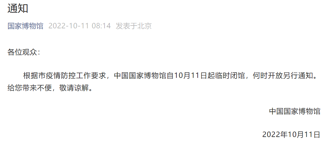 央廣網(wǎng)北京10月11日消息 據(jù)國(guó)家博物館官方微信公眾號(hào)消息,根據(jù)北京市疫情防控工作要求,中國(guó)國(guó)家博物館自10月11日起臨時(shí)閉館,何時(shí)開放另行通知。