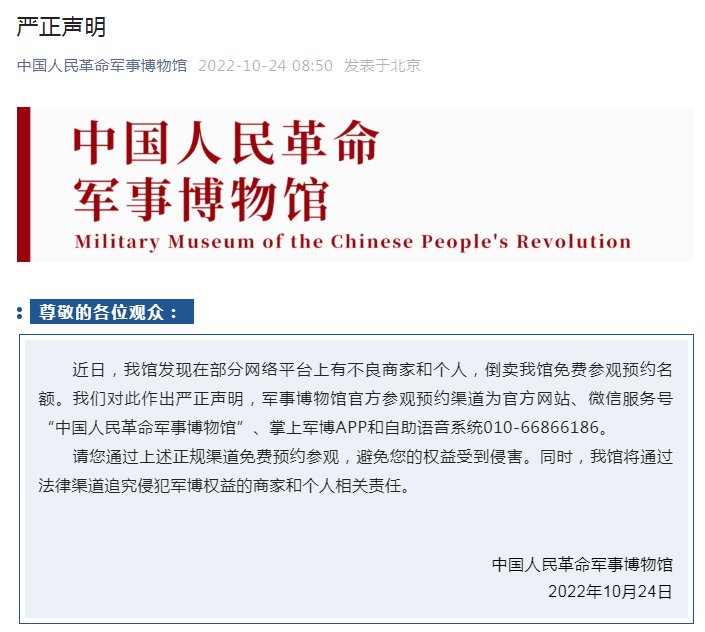 近日部分網(wǎng)絡(luò)平臺上有商家和個(gè)人倒賣該館免費(fèi)參觀預(yù)約名額。對此,軍博嚴(yán)正聲明,該館參觀預(yù)約渠道為官方網(wǎng)站、微信服務(wù)號“中國人民革命軍事博物館”、掌上軍博APP和自助語音系統(tǒng)010-66866186。觀眾要通過上述正規(guī)渠道免費(fèi)預(yù)約參觀,避免權(quán)益受到侵害。同時(shí),該館將通過法律渠道追究侵犯軍博權(quán)益的商家和個(gè)人相關(guān)責(zé)任。