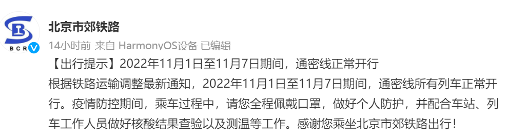央廣網(wǎng)北京11月1日消息 據(jù)北京市郊鐵路官方微博消息,根據(jù)鐵路運(yùn)輸調(diào)整最新通知,2022年11月1日至11月7日期間,通密線所有列車正常開行。