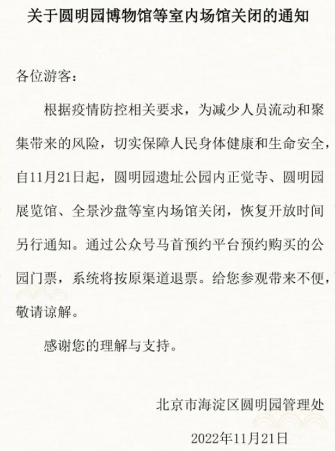 近日,北京市海淀區(qū)圓明園管理處發(fā)布關(guān)閉室內(nèi)場館的通知,自11月21日起,圓明園遺址公園內(nèi)正覺寺、圓明園展覽館、全景沙盤等室內(nèi)場館關(guān)閉,恢復(fù)開放時間另行通知。