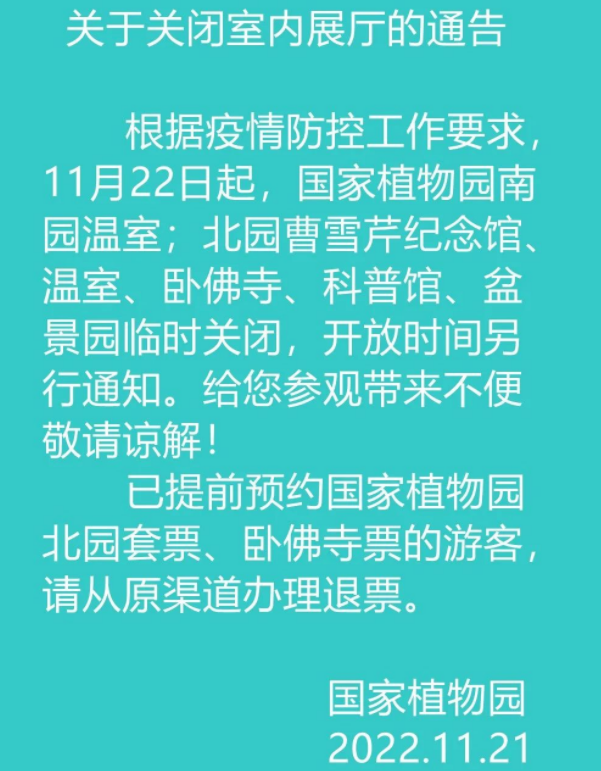 據(jù)國家植物園消息,根據(jù)疫情防控工作要求,11月22日起,國家植物園南園溫室,北園曹雪芹紀(jì)念館、溫室、臥佛寺、科普館、盆景園臨時關(guān)閉,開放時間另行通知。