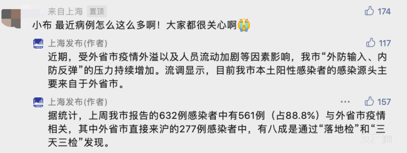 上周上海報告的632例陽性感染者中有561例(占88.8%)與外省市疫情相關(guān)(央廣網(wǎng)發(fā) 截自:上海發(fā)布微信公眾號)