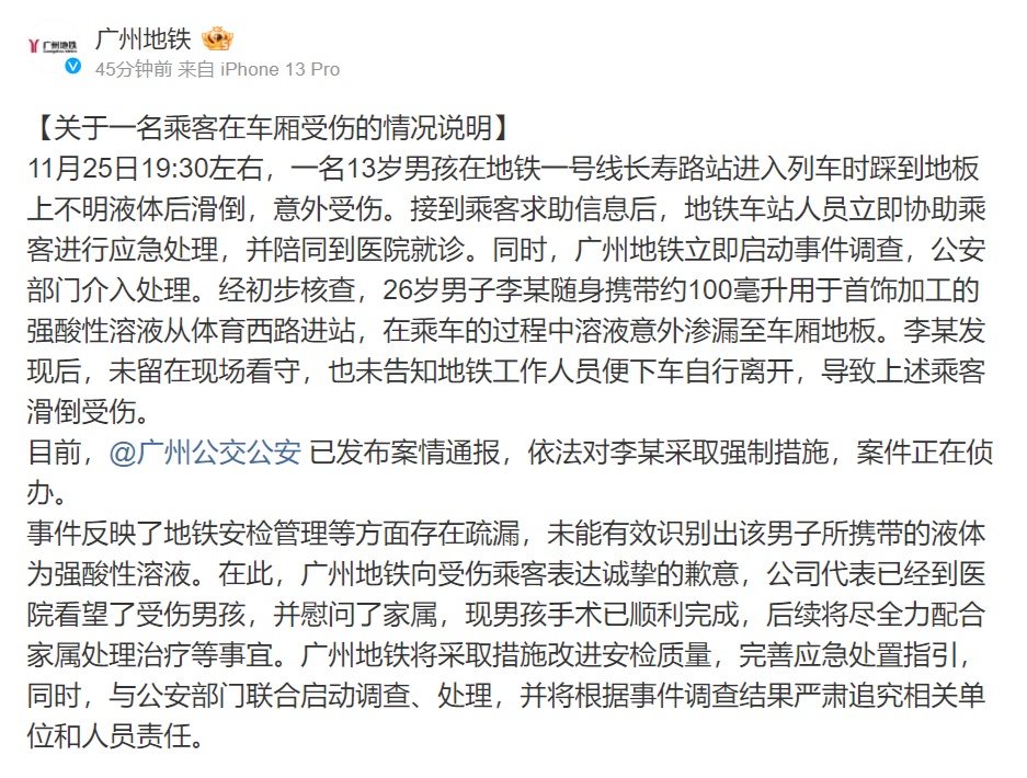 廣州地鐵方面表示,事件反映了地鐵安檢管理等方面存在疏漏,未能有效識(shí)別出該男子所攜帶的液體為強(qiáng)酸性溶液,向受傷乘客表達(dá)誠摯的歉意。廣州地鐵公司代表已經(jīng)到醫(yī)院看望了受傷男孩,并慰問了家屬,現(xiàn)男孩手術(shù)已順利完成,后續(xù)將盡全力配合家屬處理治療等事宜。
