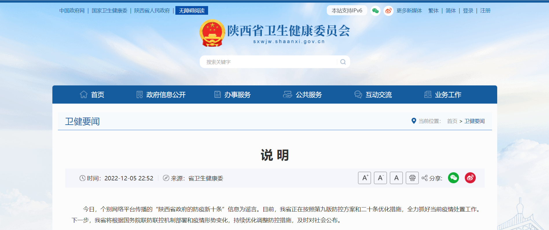 央廣網(wǎng)西安12月6日消息(見習(xí)記者侯凱奇)12月5日晚,陜西省衛(wèi)健委官網(wǎng)發(fā)布說明,明確提出個別網(wǎng)絡(luò)平臺傳播的“陜西省政府的防疫新十條”信息為謠言。
