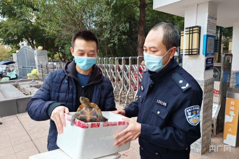 民警從魏先生手中接過野生草龜(央廣網(wǎng)發(fā) 龔軒攝)