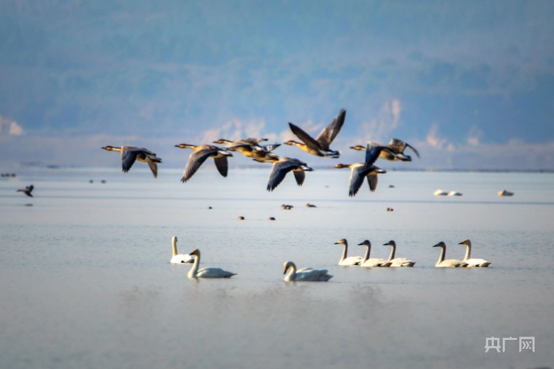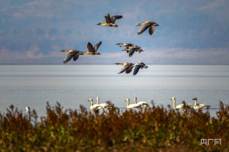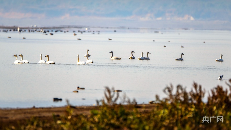 冬日暖陽下,它們或在岸邊草叢覓食,或在水面交頸相依,時(shí)而引吭高歌,似為迎接新年的到來。