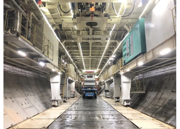 珠海興業(yè)快線隧道工程現(xiàn)場(chǎng),一臺(tái)重4500噸、超5層樓高的“地下航母”正奮勇掘進(jìn),管片一片一片拼裝,隧道隨之一米一米建成。這臺(tái)“地下航母”,就是由中交天和自主研制的中國首臺(tái)超大直徑同步掘進(jìn)機(jī)“興業(yè)號(hào)”,這也是國內(nèi)首次采用的同步掘進(jìn)設(shè)計(jì)。常規(guī)隧道掘進(jìn)機(jī)拼裝管片,一環(huán)管片寬2米,刀頭油缸推動(dòng),而油缸推動(dòng)距離僅為2米多。因而,掘進(jìn)2米后必須停止,掘進(jìn)一環(huán)耗時(shí)近60分鐘,拼裝管片一環(huán)耗時(shí)近45分鐘?!芭d業(yè)號(hào)”的關(guān)鍵在于同步掘進(jìn),它改變了傳統(tǒng)油缸設(shè)計(jì),推動(dòng)距離可延長至4米,刀頭可實(shí)現(xiàn)持續(xù)掘進(jìn),后方同時(shí)拼裝管片,施工速度較國內(nèi)外同類掘進(jìn)機(jī)提升25-35%,對(duì)超大直徑盾構(gòu)機(jī)發(fā)展具有一定劃時(shí)代意義。