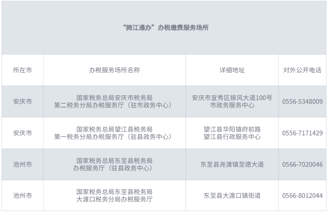 2.通辦場(chǎng)所。1.國(guó)家稅務(wù)總局安慶市稅務(wù)局第二稅務(wù)分局辦稅服務(wù)廳(駐市政務(wù)中心);2.國(guó)家稅務(wù)總局望江縣稅務(wù)局第一稅務(wù)分局辦稅服務(wù)廳(駐縣政務(wù)中心);3.國(guó)家稅務(wù)總局東至縣稅務(wù)局辦稅服務(wù)廳(駐縣政務(wù)中心);4.國(guó)家稅務(wù)總局東至縣稅務(wù)局大渡口稅務(wù)分局辦稅服務(wù)廳,以上4個(gè)辦稅繳費(fèi)場(chǎng)所均可辦理“擁江通辦”事項(xiàng),辦稅繳費(fèi)場(chǎng)所詳見(jiàn)附件1。
