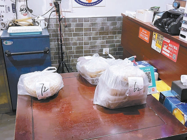 但在龍?zhí)督值酪患掖猴灥?,記者現(xiàn)場(chǎng)看到,春餅外賣只是被服務(wù)員套上塑料袋并簡(jiǎn)單系了個(gè)結(jié),放到門口的桌子上等外賣員來取,沒有貼外賣封簽,更沒有有效的密封措施。
