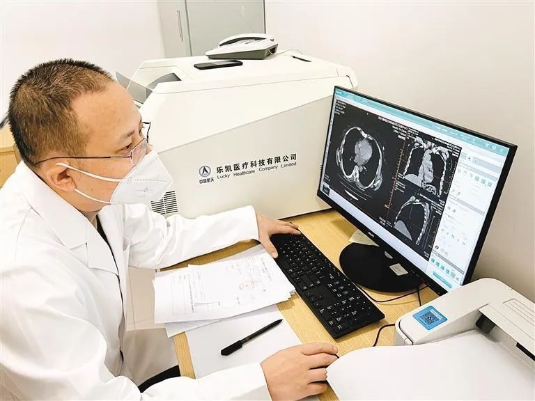 10日上午,在杜城社區(qū)衛(wèi)生服務(wù)中心診室門前,等候拍片的患者不多。在工作人員引導(dǎo)下,大家有序進(jìn)入拍攝區(qū)。診室內(nèi),陜西省康復(fù)醫(yī)院影像一科主任高雅鵬正在一個(gè)看似與普通顯示器沒什么兩樣的電腦前書寫診斷報(bào)告?!氨绕鹨话愕腃T靜態(tài)閱片,在這臺(tái)顯示器的幫助下,我們可以實(shí)現(xiàn)多角度、多方位、動(dòng)態(tài)式閱片,讓診斷更加細(xì)致精準(zhǔn)?!?高雅鵬說,這臺(tái)CT機(jī)的配置完全可以滿足周邊居民對于肺部CT的拍片需求。