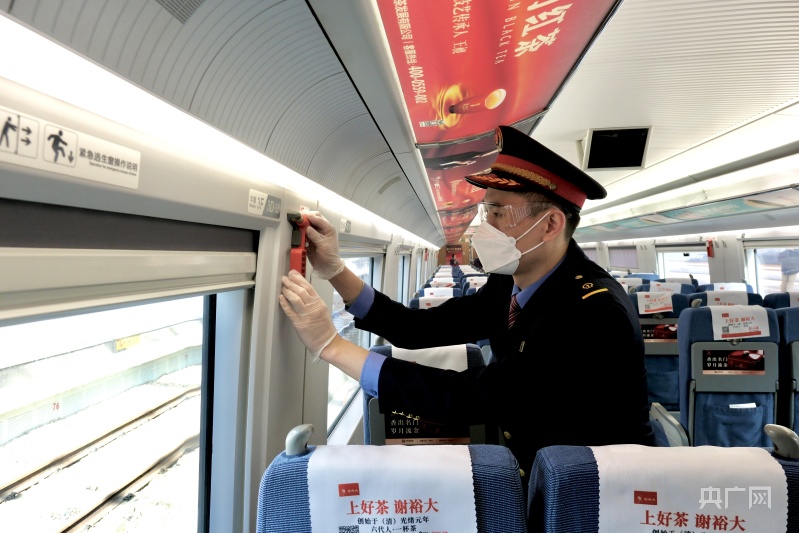 彭昊正在檢查列車內(nèi)安全設(shè)備(央廣網(wǎng)發(fā) 受訪者供圖)