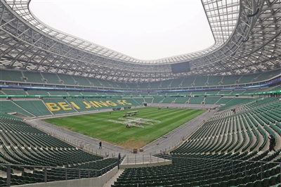 走進新工體項目區(qū)域,清灰色外立面的工人體育場在陽光下熠熠生輝,綠茵賽場整裝待發(fā),看臺上環(huán)繞著寫有“北京國安”的綠色燈條。