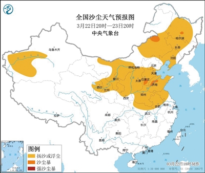中央氣象臺(tái)昨日18時(shí)繼續(xù)發(fā)布沙塵暴黃色預(yù)警,受冷空氣大風(fēng)影響,預(yù)計(jì)22日20時(shí)至23日20時(shí),新疆西南部、內(nèi)蒙古中西部和東南部、青海東北部、甘肅中部、寧夏、陜西中北部、山西、河北中南部、北京南部、天津中南部、山東、河南、安徽中北部、江蘇中北部、湖北北部、黑龍江中西部、吉林中西部、遼寧等地的部分地區(qū)有揚(yáng)沙或浮塵天氣,其中,內(nèi)蒙古中部偏北地區(qū)、黑龍江南部、河北西南部、山東西部局地有沙塵暴。