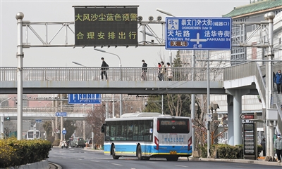 3月22日,天壇路,電子顯示屏提示,大風(fēng)沙塵藍(lán)色預(yù)警,合理安排出行。新京報(bào)記者 王飛 攝