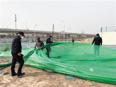 3月22日,石景山古城街道綜合行政執(zhí)法人員來(lái)到轄區(qū)內(nèi)工地,要求施工單位對(duì)裸露地面、渣土堆放場(chǎng)所及時(shí)苫蓋,施工期間進(jìn)行灑水降塵,渣土運(yùn)輸車輛確保清潔到位上路不遺撒,從源頭杜絕揚(yáng)塵污染源的發(fā)生。新京報(bào)記者 浦峰 通訊員 王亞楠 攝
