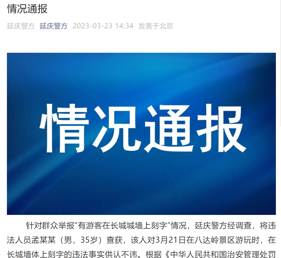 央廣網(wǎng)北京3月23日消息 據(jù)延慶警方微信公眾號3月23日情況通報, 針對群眾舉報“有游客在長城城墻上刻字”情況,延慶警方經(jīng)調(diào)查,將違法人員孟某某(男,35歲)查獲,該人對3月21日在八達嶺景區(qū)游玩時,在長城墻體上刻字的違法事實供認不諱。根據(jù)《中華人民共和國治安管理處罰法》有關(guān)規(guī)定,延慶警方已對孟某某處以行政拘留并處罰款的處罰。