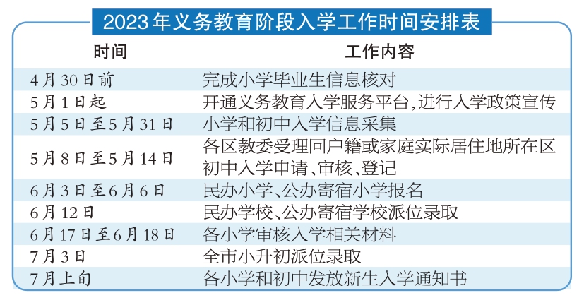 4月30日前,本市將完成小學(xué)畢業(yè)生信息核對(duì);5月1日起,義務(wù)教育入學(xué)服務(wù)平臺(tái)開(kāi)通,進(jìn)行入學(xué)政策宣傳;5月5日至5月31日,進(jìn)行小學(xué)和初中入學(xué)信息采集。