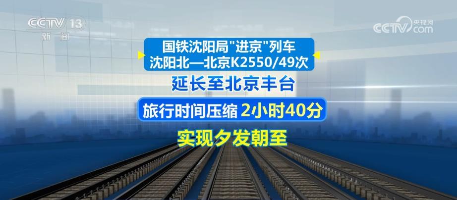此次調(diào)圖,國鐵沈陽局“進京”列車沈陽北—北京K2550/49次延長至北京豐臺,旅行時間壓縮2小時40分,實現(xiàn)夕發(fā)朝至。