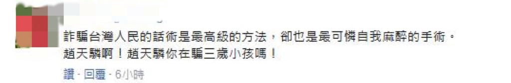 也有臺(tái)灣網(wǎng)友評(píng)論表示“果然是綠色邏輯思維,沒有最勇敢,只有最無知!”“趙天麟是在說相聲嗎?真愛鬼扯!”“詐騙臺(tái)灣人民的話術(shù)是最高級(jí)的方法,卻也是最可憐自我麻醉的手術(shù)!趙天麟?。≮w天麟你在騙三歲小孩嗎?”