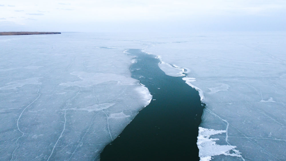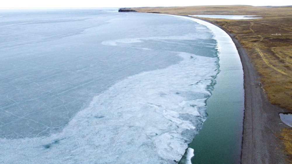 這是4月17日拍攝的呼倫湖開湖景象(無人機(jī)照片)。新華社記者 王楷焱 攝