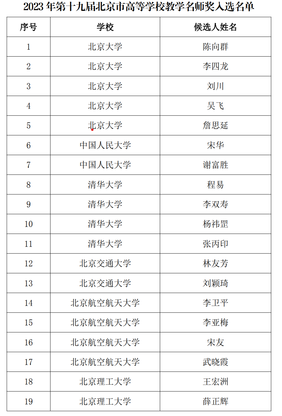 央廣網北京9月6日消息 據“首都教育”微信號消息,經學校推薦、評審專家組評議、評審委員會投票、北京市教委審核并公示,決定授予北京大學陳向群等78名教師第十九屆北京市高等學校教學名師獎、清華大學彭建敏等64名教師第七屆北京市高等學校青年教學名師獎。