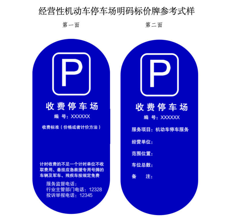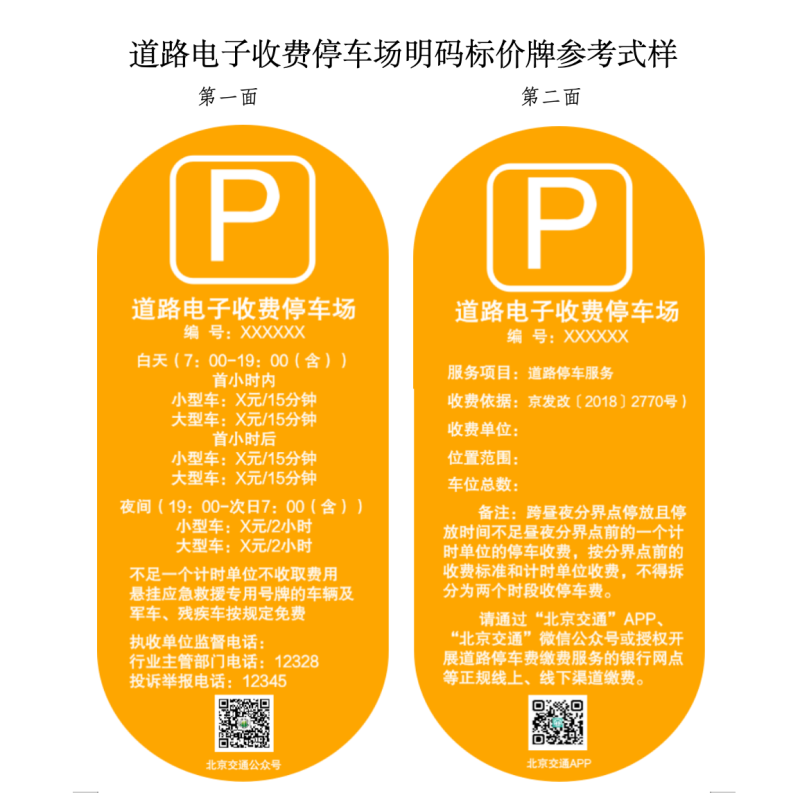 根據(jù)相關(guān)法規(guī)政策的新要求,按照依法合規(guī)、便民利民、不做大改的原則,征求意見稿對兩種機動車停車場明碼標價牌參考式樣進行了修改完善,并附上“經(jīng)營性機動車停車場明碼標價牌參考式樣”和“道路電子收費停車場明碼標價牌參考式樣”,供相關(guān)單位參照自行制作明碼標價牌,明碼標價牌編號為北京市公共停車場經(jīng)營備案證的備案號。