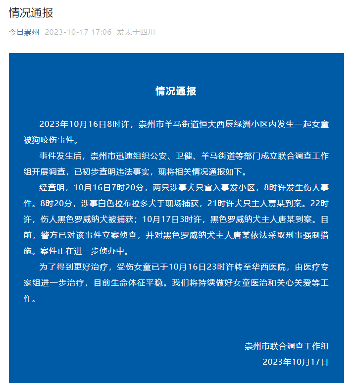 剛剛,“今日崇州”微信公號發(fā)布通報:16日8時20分,涉事白色拉布拉多犬于現(xiàn)場捕獲,21時許犬只主人賈某到案。22時許,傷人黑色羅威納犬被捕獲;10月17日3時許,黑色羅威納犬主人唐某到案。目前,警方已對該事件立案偵查,并對黑色羅威納犬主人唐某依法采取刑事強制措施。案件正在進一步偵辦中。