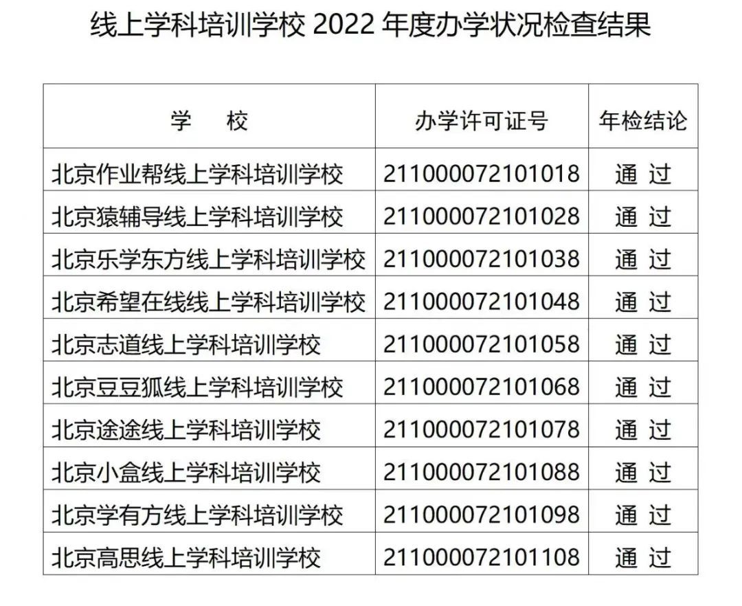 北京市教委公布2022年線上學(xué)科培訓(xùn)學(xué)校辦學(xué)評(píng)估結(jié)果 10家通過