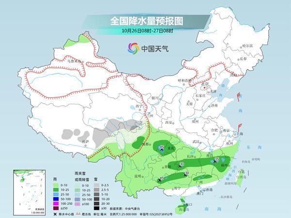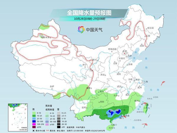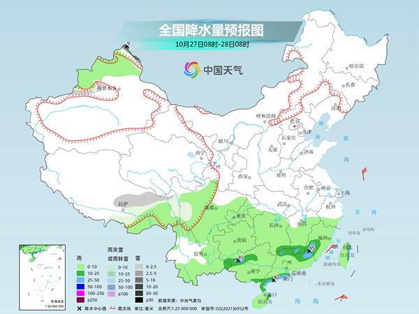 明天開始,降雨的重心將逐漸向華南轉(zhuǎn)移。預(yù)計新疆北疆北部、西藏東部等地部分地區(qū)有小到中雪或雨夾雪,局地大雪。西南地區(qū)大部、江南大部、華南等地有小到中雨,局地大雨。
