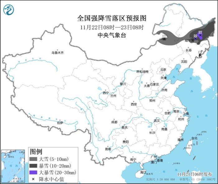 11月22日08時(shí)至23日08時(shí),內(nèi)蒙古東部、黑龍江中東部、吉林長(zhǎng)白山區(qū)等地部分地區(qū)有大到暴雪,黑龍江中部偏南地區(qū)局地有大暴雪(20~27毫米),上述部分地區(qū)新增積雪深度6~15厘米,局地20厘米左右。