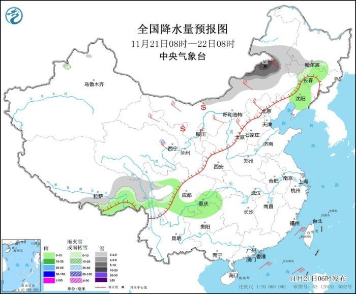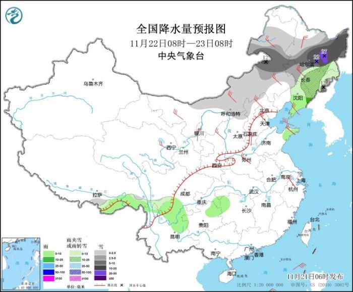 11月21日08時(shí)至22日08時(shí),內(nèi)蒙古東部、黑龍江西南部、吉林西部等地部分地區(qū)有小到中雪或雨夾雪,其中,內(nèi)蒙古東部局地有大到暴雪(10~12毫米)。吉林中部、遼寧大部、西藏東南部、四川盆地南部、重慶大部、貴州北部、云南東北部等地部分地區(qū)有小雨。西北地區(qū)中部和東北部、內(nèi)蒙古大部、華北西部和北部等地部分地區(qū)有4~6級(jí)風(fēng)。內(nèi)蒙古河套地區(qū)、甘肅河西等地局地有揚(yáng)沙(見(jiàn)圖6)。