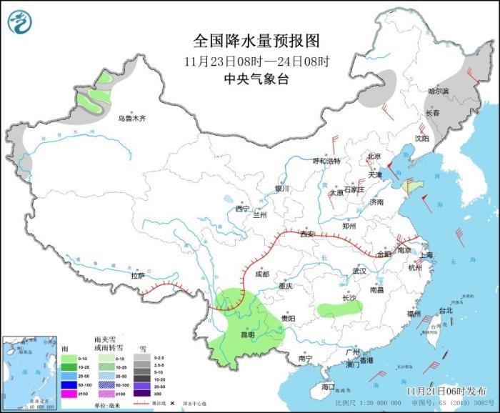 11月23日08時(shí)至24日08時(shí),新疆西部、內(nèi)蒙古東部、東北地區(qū)中東部、山東半島等地部分地區(qū)有小雪或雨夾雪,局地有中雪。湖南南部、四川南部、云南大部等地部分地區(qū)有小雨。內(nèi)蒙古中東部、東北地區(qū)大部、華北大部、山東半島、江南東部等地部分地區(qū)有4~6級(jí)風(fēng)(見(jiàn)圖8)。