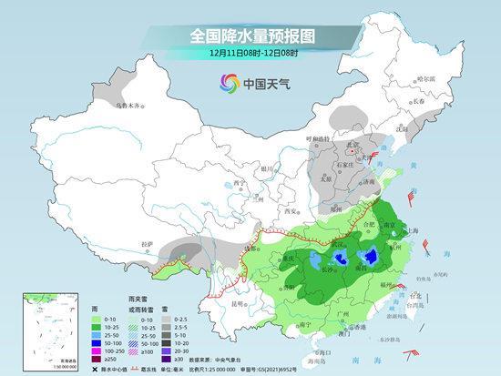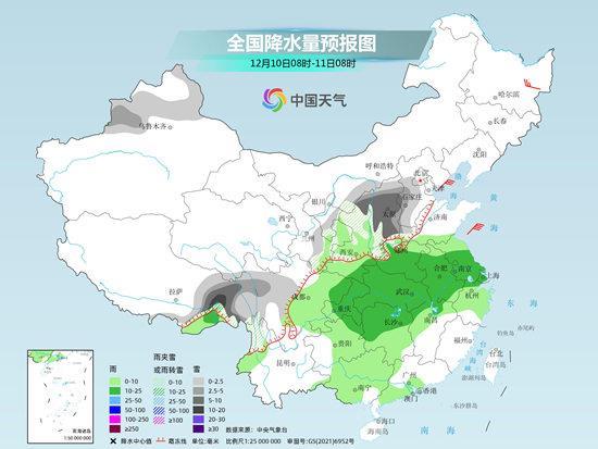 “預(yù)計(jì)12月10日開始,隨著暖濕氣流加強(qiáng)北上,與北方南下的冷空氣相結(jié)合,中東部地區(qū)將迎來(lái)大范圍雨雪天氣?!蹦壳皝?lái)看,10日至11日,華北、東北部分地區(qū)有小到中雪、局地大雪,黃淮北部、陜西北部有雨轉(zhuǎn)雨夾雪或雪,黃淮南部、江漢、江淮、江南、華南北部等地有小到中雨,局地大雨。