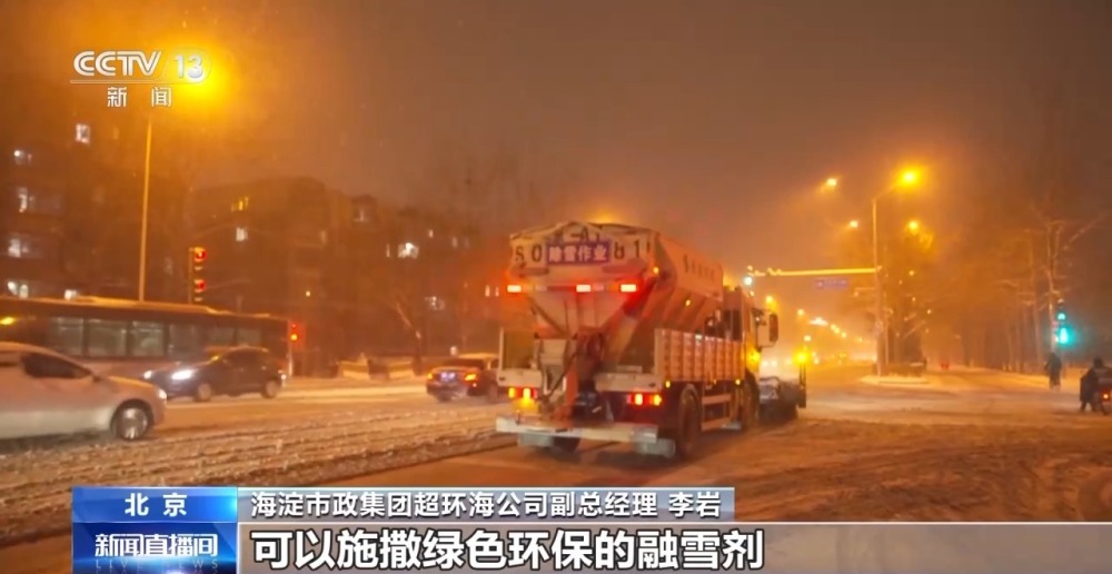 海淀市政集團(tuán)超環(huán)海公司副總經(jīng)理 李巖:通過人機(jī)配合的工作模式,縮短道路恢復(fù)的時間。大型的機(jī)械設(shè)備,主要是多功能除雪車,前面有滾刷,可以將雪打碎,后面有撒布設(shè)備,可以施撒綠色環(huán)保的融雪劑。