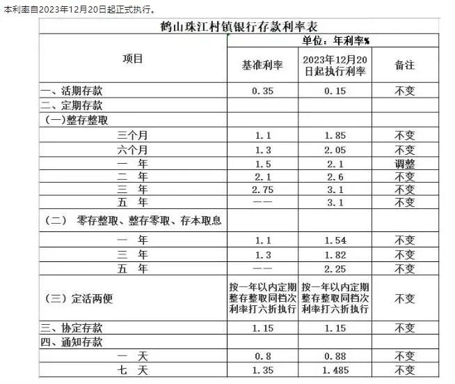 鶴山珠江村鎮(zhèn)銀行調整定期存款利率通告。截圖自鶴山珠江村鎮(zhèn)銀行微信公眾號