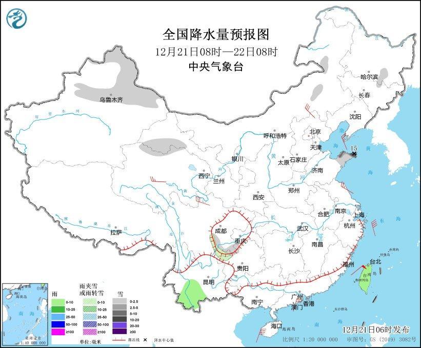 圖3 全國降水量預(yù)報圖(12月21日08時-22日08時)