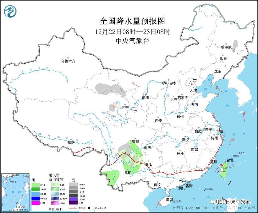 12月22日08時至23日08時,山東半島、青海北部和東部、甘肅河西、四川南部、貴州西北部、云南東北部等地部分地區(qū)有小雪或雨夾雪,其中,山東半島北部等地部分地區(qū)有中雪。四川盆地南部、云南西南部和中部、臺灣島大部等地部分地區(qū)有小雨。內(nèi)蒙古西部、青海東部和南部等地部分地區(qū)有5~7級風(見圖4)。