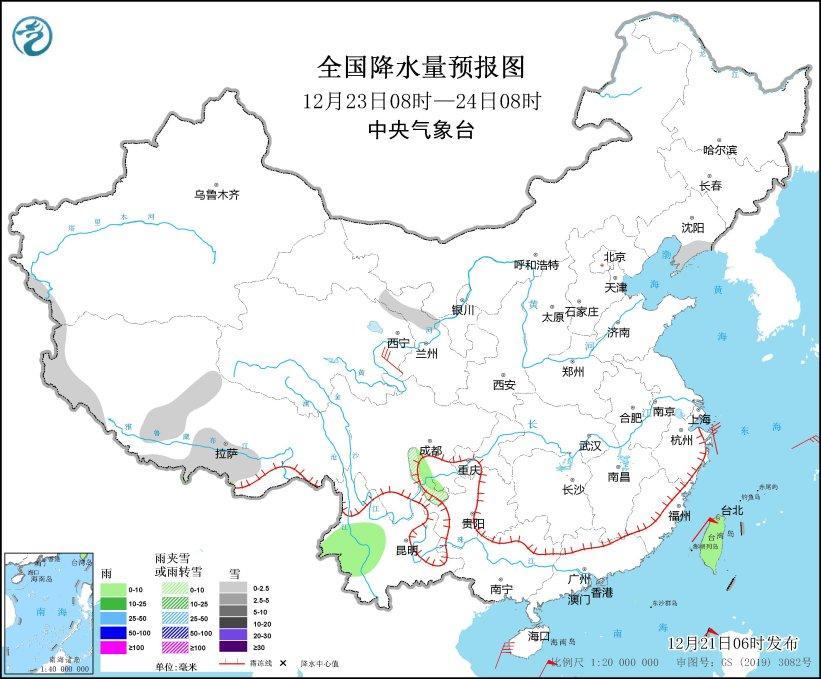 12月23日08時至24日08時,遼東半島、西藏南部和西部、甘肅河西等地部分地區(qū)有小雪或雨夾雪。四川盆地西南部、云南西部、臺灣島等地部分地區(qū)有小雨。青海東部、浙江東部等地部分地區(qū)有4~6級風(見圖5)。