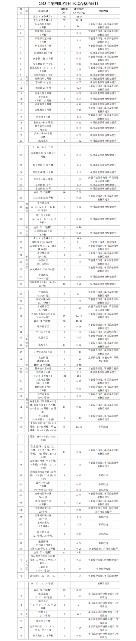 央廣網(wǎng)北京12月22日消息(記者門庭婷)12月22日,北京市住房城鄉(xiāng)建設(shè)委公布了2023年第四批老舊小區(qū)綜合整治項(xiàng)目名單,共有78個(gè)項(xiàng)目納入改造計(jì)劃,涉及改造樓棟數(shù)300棟,2萬(wàn)戶,改造建筑面積144萬(wàn)平方米。