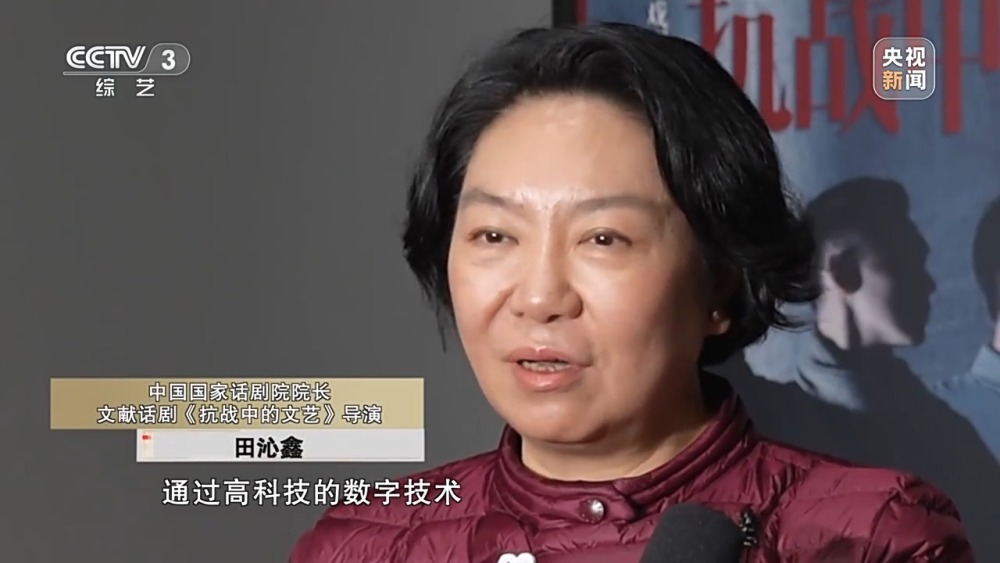 中國國家話劇院院長 文獻(xiàn)話劇《抗戰(zhàn)中的文藝》導(dǎo)演 田沁鑫:在舞臺方面,也是打破了時空的界限,通過高科技的數(shù)字技術(shù),影視化的多機(jī)位多角度的拍攝手法,將裝置影像藝術(shù)和戲劇表演藝術(shù)相融合,以戲劇電影的方式講好中國故事。