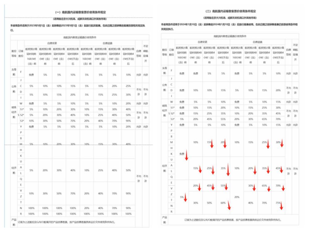南航退改規(guī)則調整前后手續(xù)費收取標準對比