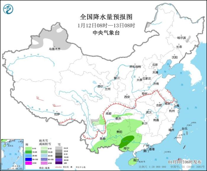 1月12日08時至13日08時,新疆北疆北部、川西高原南部等地部分地區(qū)有小雪或雨夾雪。四川盆地南部、湖南西部、貴州、云南東部和南部、廣西、海南島等地部分地區(qū)有小到中雨。西藏中部部分地區(qū)有5~6級風(fēng);南海東部和西南部等海域有6~7級風(fēng)、陣風(fēng)8級。