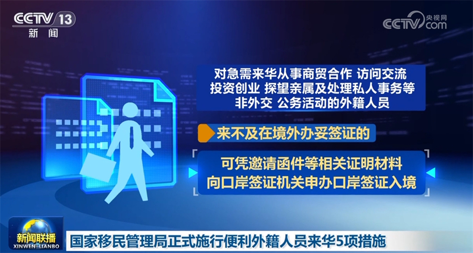 5項(xiàng)新舉措主要包括:放寬來華外籍人員申辦口岸簽證條件。對急需來華從事商貿(mào)合作、訪問交流、投資創(chuàng)業(yè)、探望親屬及處理私人事務(wù)等非外交、公務(wù)活動(dòng)的外籍人員,來不及在境外辦妥簽證的,可憑邀請函件等相關(guān)證明材料向口岸簽證機(jī)關(guān)申辦口岸簽證入境。